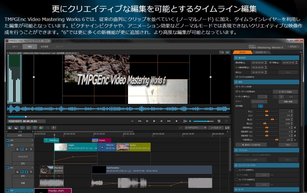 サクサクカットできる編集機能や、タイムライン編集・1フレーム毎の細かい編集・モザイク処理・TV番組のようなテロップ付け・ピクチャー・イン・ピクチャーも手軽に実現できるなど、あなどれません。